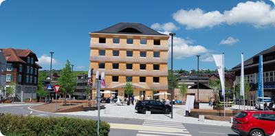 (Egg) Knapp zehn Jahre dauerte es bis zur Fertigstellung der neuen Ortsmitte in Egg, Bregenzerwald, Vorarlberg.