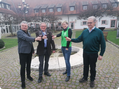Unser Bild zeigt von links nach rechts: René Gessler (Geschäftsführer Hotel/Restaurant Schloss Reinach Freiburg-Munzingen), Günter Linser (Vorsitzender Tuniberg Wein), Ulrike Weiß (Geschäftsführerin Naturgarten Kaiserstuhl, Breisach) und Heinz Jakob (Vorstand Tuniberg Wein). Bild: Matthias Reinbold