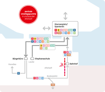 Wer mit einer der anderen Linien in die Innenstadt fährt und zum Bahnhof möchte, muss spätestens an der Haltestelle Bürgerbüro umsteigen. Die Linien 2, 3, 4/13, 13/4, 12, 14 sowie der City-Shuttle enden an der Haltestelle Bürgerbüro. Die Busse wenden und starten dann wieder ab der Haltestelle Stephansschule. Die Linie 908 fährt in Richtung Schweiz über den Rheinsteig und die Laube ohne Halt bis zur Haltestelle Bodanplatz; die Haltestellen Konzilstraße/Theater stadteinwärts und Marktstätte werden nicht mehr bedient. Bei den Linien 1, 11 und 15 gibt es keine Änderungen zum Fahrplanwechsel.