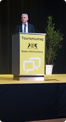 Mit rund 800 Teilnehmerinnen und Teilnehmer aus Politik und Tourismus ist die etablierte Branchenveranstaltung der größte touristische Fachkongress des Landes. Traditionell dient die Veranstaltung als Impulsgeber und Diskussionsplattform für zukunftsweisende Themen. Patrick Rapp, Staatssekretär im Ministerium für Wirtschaft, Arbeit und Tourismus, betonte in seiner Begrüßung: „Der Tourismus in Baden-Württemberg darf für das abgelaufene Tourismusjahr 2024 auf Rekordzahlen hoffen und ich freue mich sehr über die stark gestiegene Nachfrage bei den internationalen Gästen.“ Weiter machte der Staatssekretär deutlich: „Unsere Gäste stehen im Mittelpunkt unseres Handelns. Ihnen eine unvergessliche Zeit bei uns schenken zu dürfen, das ist unsere gemeinsame Motivation, denn der Gästefokus wird im Tourismus immer mehr zur Königsdisziplin."