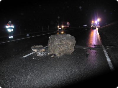 Dabei stürzte ein ca. 1 Kubikmeter großer und ca. 1,8 Tonnen schwerer Felsbrocken auf die Fahrbahn der Bregenzerwaldstraße (L 200). Die Fahrbahn wurde von der Sektorenstreife Bezau abgesichert. In weiterer Folge wurde der Felsbrocken mit einem Radlader entfernt. Verletzt wurde niemand. Es konnten keine Schäden festgestellt werden. Nähere Umstände werden mit Hilfe der Landesgeologin am Tage abgeklärt werden und evtl. weitere notwendige Maßnahmen zu setzen. Einsatzkräfte: Feuerwehr Reuthe, Straßenmeisterei, Polizei.