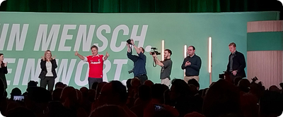 Was aber sicherlich für wenig Begeisterung sorgen wird, ist die Planung der Veranstaltung, die nicht das bot was Habeck vermitteln wollte: Professionalität. Weder hat man sich Gedanken darüber gemacht, dass in Freiburg durchaus Begeisterung vorhanden sein könnte wenn der Spitzenkandidat auftritt, noch hat man die Vertreter der Medien richtig platziert oder die Anmeldungen registriert. So kam es wie es kommen musste. Über 800 Menschen wurden nach Angaben der Polizei gleich gar nicht in die Messehalle gelassen wegen Platzmangel. Besonders ausgewählte Persönlichkeiten waren in vordersten Reihen versammelt, während die Vertreter der Medien schauen konnten wo es noch freie Plätze gab - an einen geeigneten Blick für Bilder oder Videos ist schon gar nicht mehr zu denken gewesen dadurch.