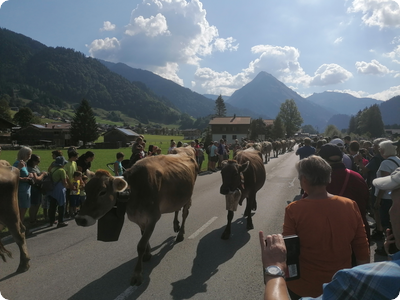 Und wer Glück hatte mit der Fahrt auf über 2000 Meter Höhe konnte sogar noch das eine oder andere Reh oder eine Gämse sehen - also Natur pur. Allerdings auch nicht immer wie die eindeutigen Hinweisschilder mittlerweile zeigen und auch hier zur Rücksicht zwischen Mensch und Tier aufrufen. Aber an diesem Abend gab es dann doch nur Augen für die letzten Minuten der untergehenden Sonne auf dem Gipfel des Diedamskopfes. Natürlich dichtes Gedränge, alle Besucher wollen beste Bilder und Videos aufnehmen. Aber die Stimmung bleibt entspannt und auch die Paraglider stürzen sich noch schnell in die Lüfte, bevor es dunkel wird. So ergibt sich ein imposantes Bild der untergehenden Sonne im Bodensee. Natürlich ganz nach dem Geschmack der vielen hundert Besucher - und sie werden nicht enttäuscht. Die Sonne liefert ihr eindrucksvolles Naturschauspiel gekonnt ab und Zufriedenheit macht sich breit nachdem auch die letzten Bilder und Videos mit der untergegangenen Sonne gerade noch mit der Kamera oder sogar Drohne festgehalten werden. Die Natur hat gezeigt was sie kann und so ist es dann auch zum Empfang der Kühe an der Ur-Alpe in Au. Nicht alle Kühe haben den Sommer unbeschadet auf den Alpen überstanden und so sind auch nicht alle Kühe festlich geschmückt. Aber immerhin musste noch kein Wasser zu den Alpen geliefert werden und so zeigten sich die Landwirte insgesamt zufrieden mit dem Verlauf der Saison auf den Alpen. Man hofft jetzt noch auf ansprechendes Wetter in den kommenden Wochen um die Kühe noch lange an der frischen Luft "arbeiten" lassen zu können. Und so wurde der Tag zu einem Festtag im Bregenzerwald, begleitet von vielen tausend Gästen.