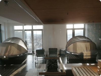 Unser Bild von Matthias Reinbold zeigt einem Blick aus der Sauna auf Ruheraum und die Stadt Lörrach.