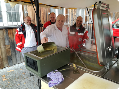 (Freiburg) Schon früh duftete es am heutigen Samstag im Ferdinand-Weiß-Haus Freiburg köstlich nach frisch zubereiteten Karotten oder Kartoffeln samt Wienerle, die sich im riesigen Kochtopf der DRK-Feldküche des Kreisverbandes Freiburg nach und nach zu einem schmackhaften Erbsen-Eintopf vereinten. Dieser wurde dann den zahlreichen Menschen im Ferdinand-Weiß-Haus kostenlos zum Mittagessen angeboten.