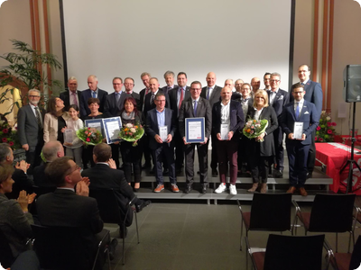 Unser Bild von Matthias Reinbold zeigt die Unternehmen des Jahres mit ihren Laudatoren und Gästen.